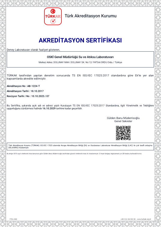 OSKİ Genel Müdürlüğü Su ve Atıksu Laboratuvarı TS EN ISO/IEC 17025:2012 Standardına göre TÜRKAK tarafından 18 Ekim 2017 tarihinde akredite edilmiştir.